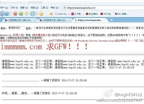 方滨兴生日当天晚上,可能吧网站负责人阿禅表示,请容我在你生日之日祝你被报复。随后,有网友发现北京邮电大学的网站被攻击,网站首页被替换成一个“GFW不灭明年我还会来”。