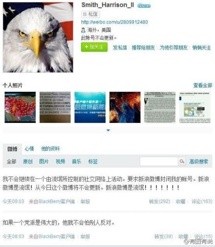 美国驻上海总领事馆发言人Smith-Harrison的微博帐号被禁言,他随后建立了新帐号@Smith_Harrison_II,并发了一条微博表示:我不会继续在一个由流氓所控制的社交网络上活动。要求新浪微博不要封闭我的帐号。新浪微博是流氓!从今日这个微博不会更新,新浪微博是流氓!