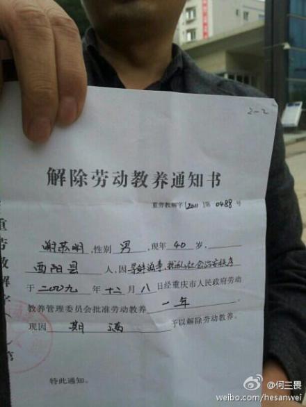 2009年11月12日,居住在重庆渝北的男子谢苏明因为在互连网上的一句跟帖遭到劳教一年。近日谢苏明的案子在网络引起讨论,他希望当局能还他清白,并取消劳教制度。