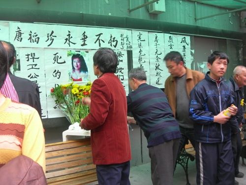在来自余杭等地的公民发言之后,大家在唐福珍的灵前鞠躬献花,举着唐福珍的遗像,呼喊着:“依法维权、保卫家园”、“公平无价”、“追求正义”、“维护宪法”、“捍卫人权”等口号来到耶稣堂弄,张贴挽联,悬挂唐福珍的遗像。