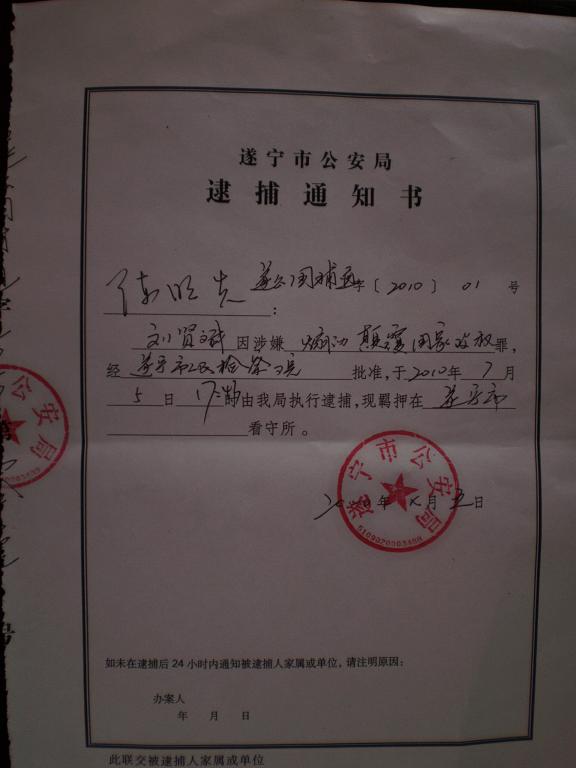然而,就在大家全力声援刘贤斌,希望警方立足事实、遵从法律、顺应民意,还刘贤斌以自由时,遂宁国保今天(7月6日)上午9点10分打电话,还交给陈明先对刘贤斌进行逮捕的家属通知书,通知书上显示对刘贤斌逮捕的时间是7月5日17时43分。据刘贤斌先生的辩护律师马小鹏先生的消息,刘贤斌先生已于今日(7月5日)被四川遂宁当局正式逮捕。