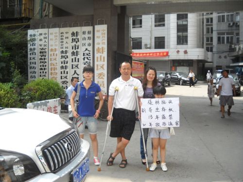 安徽维权民运人士张林今日(7月27日)在亲友的陪同下,前往安徽省蚌埠市蚌山区政府举牌抗议政府剥夺其生存权利。张林曾经是网络作家,每月所获稿费足以养家糊口。但是自从张林去年8月出狱以来,当局便肆意曲解‘剥夺政治权利’的法律条文,强行剥夺了张林出国治病的权利,甚至剥夺了张林发表文章、挣稿费吃饭的权利,实在令人难以容忍。