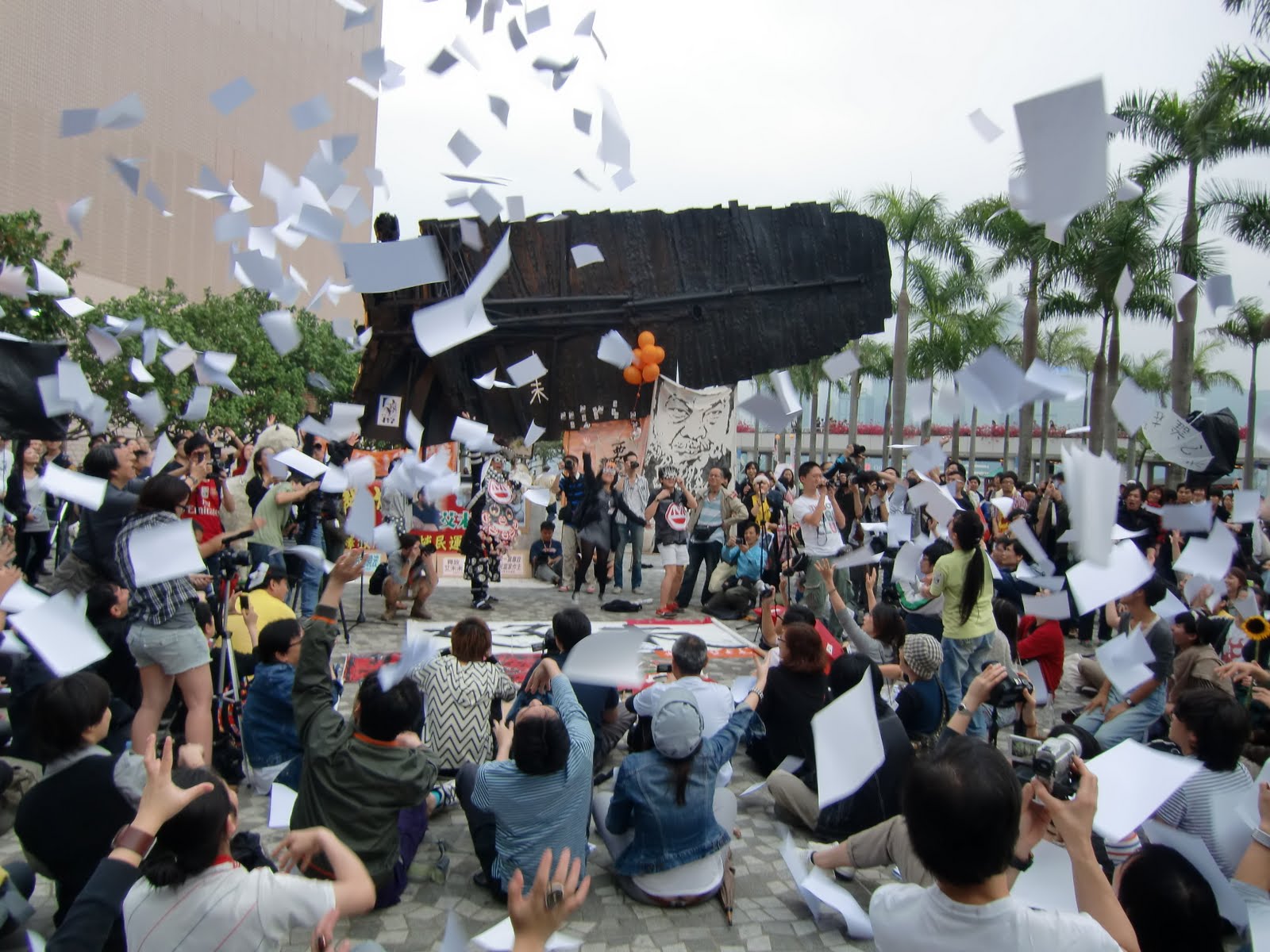 圖12:集會者向空中拋出的無數張白紙,像雪片一樣飛,象征創作自由、表達自由的無拘無束。