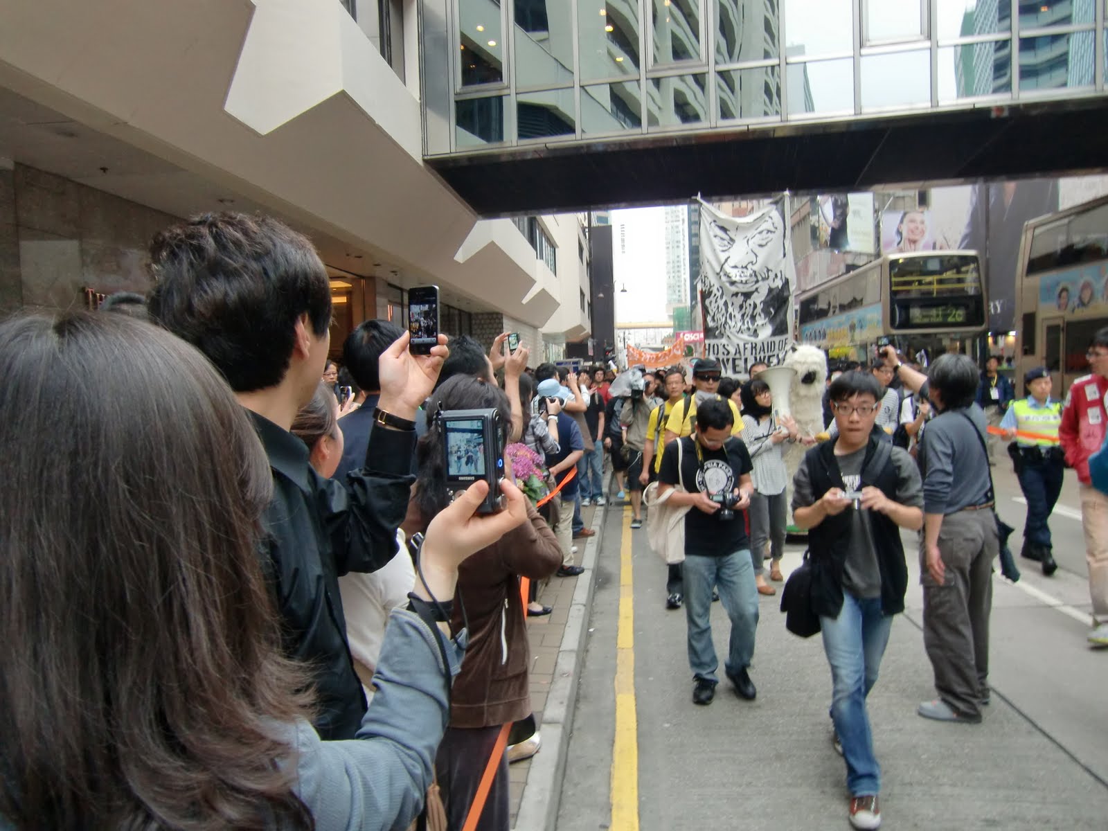 【独立中文笔会自由写作委员会2011年4月23日香港讯】今天是星期六周末,香港也正值复活节假期,细雨若断若续,游人如梭如织。而成百上千的香港艺术界人士下午于香港九龙商业中心区举行“4.23艺术公民大声行”游行集会,旨在“以一国两制下仅存的起码的表达自由,为(中国大陆境内)其它不能畅所欲言、基本人权不得保障的人们发声”。游行人群在旺角商业区人行步道聚集,下午3时起,诉求强烈明确、表现形式多姿多彩的游行队伍在“草泥马”道具车的引导下,高举艾未未肖像和“艺术无惧,真相无罪”的前导横幅,开始沿著主要商业街弥敦道向尖沙咀进发。沿途香港民众及大陆自由行游客纷纷驻足围观,拍照留念——经济繁荣的香港,艺术家勇敢抵御政府和警方的威吓与打压,艺术自由、创作自由、表达自由的元素顽强发酵,令人印象深刻。下午5时30分左右,游行队伍陆续抵达终点,据组织方称游行队伍在尖沙咀文化中心聚集时有二千人。警方则表示,游行队伍开始时约500人,抵达文化中心约900人。