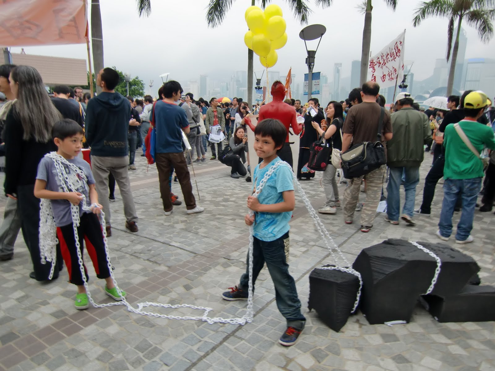 圖9:兩位參加遊行的小朋友模仿大人表演行為藝術。