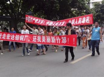 因担心生存环境被污染、危害居民的身体健康,四川什邡七月一日开始,爆发民众抗议在当地修建钼铜化工厂的示威活动,当地政府先在出动警察以武力镇压抗议示威民众不果后,迅速改变态度,将该项目叫停,并发布通告称:因部分群众对宏达集团的钼铜项目建设表达不同意见,为维护群众合法利益,确保社会大局稳定,决定责成宏达股份从即日起停止建设;