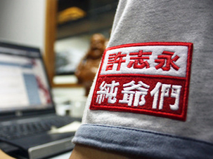图片:在深圳经营服装的青年张扬与几名网友合作设计制作了一批刺绣着“许志永,纯爷们”字样的徽章。(照片来自张扬的博客和网店)