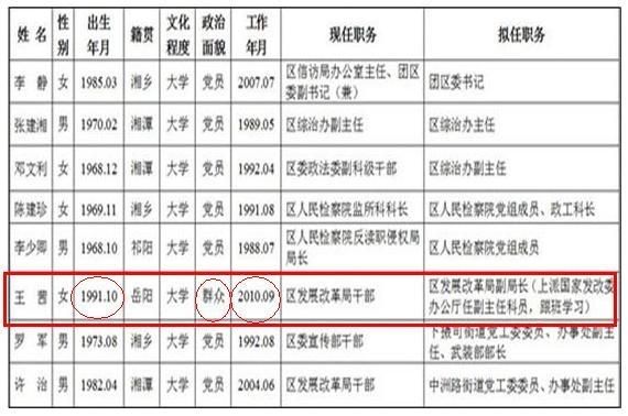 18日,湖南湘潭岳塘区公示干部任职中一名1991年出生的女孩王茜拟任区发展改革局副局长,上派发改委办公厅任副主任科员。该名女孩于2010年9月参加工作,现任区发展改革局干部,文化程度为大学。