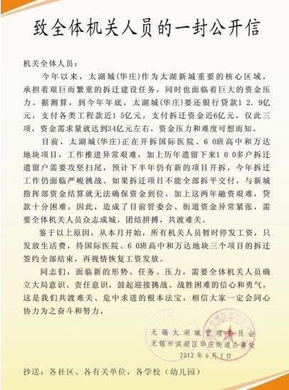 6月5日,无锡太湖城管委会和无锡市滨湖区华庄街道向全体机关人员发了一封公开信称,当地政府的拆迁工作推进异常困难,当局的资金异常紧张,融资艰难,贷款困难,所以从6月份起开始,所有机关人员停发工资,只发生活费,等几个拆迁项目签约全部结束后,再视情况恢复工资发放。
