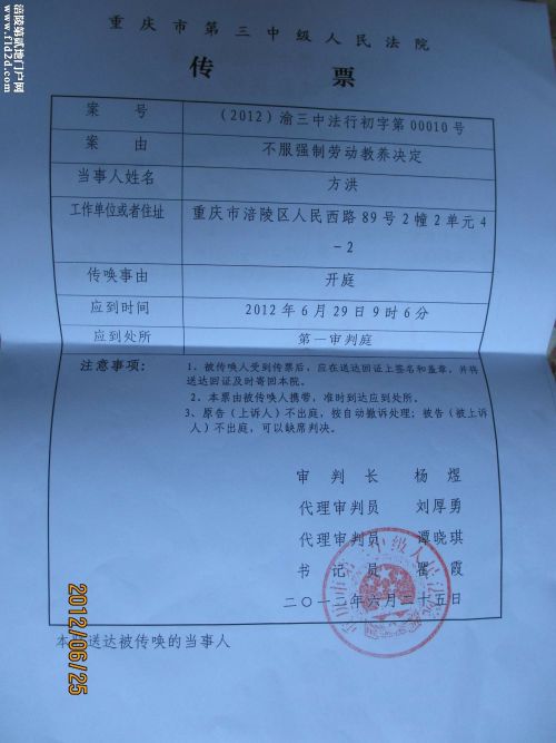 随后几个小时,方洪(方竹笋)本人也发帖称:重庆市第三中级人民法院决定2012年6月29日上午9点在其第二审判厅审理,本人诉重庆市人民政府对其非法劳教一案,届时中国行辩第一律人袁裕来律师、斯伟江律师将出庭代理其案件,这次的审理结果将永载中国法制史!好多国家的记者都要来,就此事我问了庭长的,他同意,关于准不准录音、录象要请示领导后决定。方并上传了法院传票单。