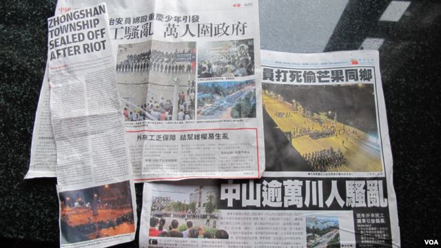 香港明报、苹果日报和南华早报报道中山骚乱事件