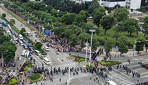 数千名四川民工6月26日(周二)到沙溪镇包围镇政府,大批防暴警察于现场戒备,封锁大道。(沙溪镇市民关先生提供)