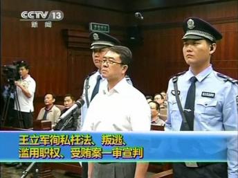 四川成都市中级人民法院今(24日)早上就王立军涉及薄熙来妻子谷开来杀害英国商人海伍德一案作出判刑,裁决指,王立军因为徇私枉法罪,判监七年;受贿三百万元人民币,判监九年;到美国驻成都领事馆逗留一晚,事涉叛逃罪,判监两年;滥用职权则判监两年;各罪并罚,判入狱十五年。