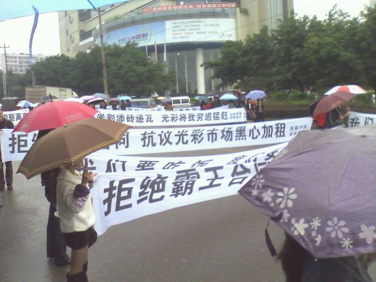 中国茉莉花网站上登载了大量商户堵路示威照片,从中所见商户们在马路上打着多幅白色条幅,上面写着“拒绝霸王合同”“保卫光彩保卫家”,“抗议光彩市场黑心加租”等。
