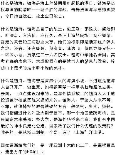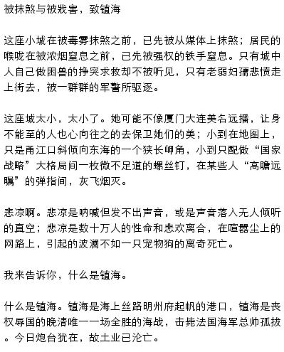 附:远在上海的镇海人“东风射马耳”在天涯发不出去,审核无法通过的长微博: 致镇海,被抹煞与被戕害的故土