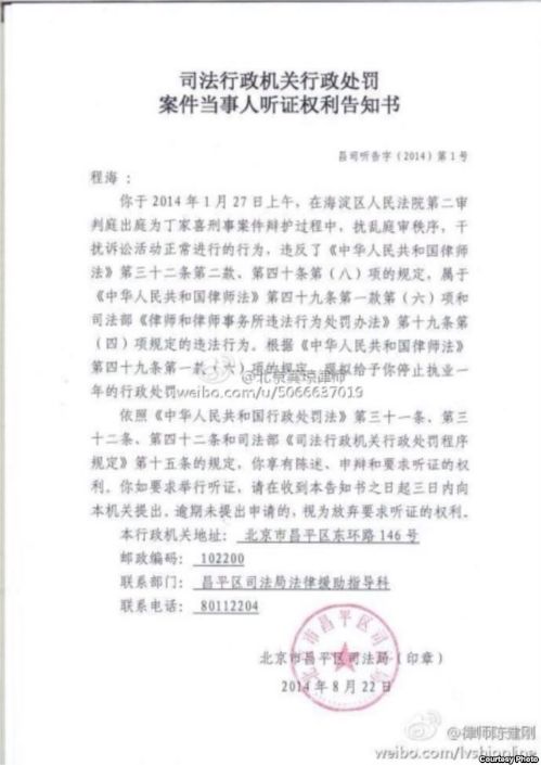 北京市昌平区司法局的书面通知(程海律师微博图片 ) 声明强调,在庭审过程中,程海律师为争取正当合法的诉讼权利而离开法庭前往法律监督机构进行控告,完全是在履行律师的法定职责,是为维护当事人的合法权益、捍卫法律正确实施、维护社会公平正义。 声明促请北京昌平区司法局收回决定,不要恣意处罚维权律师,不能沦为违法者打压律师的工具。 程海律师星期二在回应美国之音询问时表示,丁家喜案件的审理出现多处违法情况,例如上级检察院人员违法担任公诉人,检察院在审查、起诉阶段不通知 被告和律师,很快起诉,剥夺了律师阅卷、提供辩护意见的权利,而法院私自会见被告人,秘密将被告人从看守所拉倒法院进行审讯,违反了公开审理的规定,属于 违法会见被告人,法律规定法官和检察员必须回避,而法院不理睬律师的回避申请。此外,法院还拒绝给律师复制视频证据,并限制律师发言等,为了维护公平和正 义,他被迫退庭抗议并依法提出控告,何罪之有? 他说: “这个案件本身是一个大范围的违法犯罪。我在二审辩护词中提出来了,对126个公检法人员,包括一审、二审的法官、检察官,都提起了刑事控告,一个是枉 法,一个是滥用职权、玩忽职守。所以,他们也是报复陷害吧。要求处罚的起因是海淀区法院的法官被投诉控告了。他在我们闭庭以后的5月22号,给北京市司法 局一个司法建议,要求对我进行处罚,说我扰乱法庭秩序。我明明是出去控告你,怎麽会是扰乱法庭秩序呢。” 程海律师表示,他已经向昌平区司法局提出听证请求,如果任由处罚成立,将严重影响律师的合法辩护活动,冲击社会公平正义和法治社会的建设。 他说:“这个事情是对律师权益的一个重要的,如果处罚成立,那律师以后都没法干了,投诉控告也会变成一个违法行为了。这还了得呀,得依法呀。” 曾代理丁家喜案的广东律师隋牧青近日表示,出任丁家喜律师的辩护人看来要付出代价,海淀法院非法对他罚款千元并剥夺辩护人资格时他并未做强烈反应。不料,海淀法院竟然继续追杀,要求司法局严厉处罚,停业半年的处罚可能只是一个起点,事态比他想象的要严重。 参加声援程海律师声明联署的北京律师陈建刚表示,有关当局准备处罚代理政治敏感案件的程海律师,明显的是秋后算账,报复维权律师。 他说:“这就是对律师的秋后算账、压迫。人所共知的市公安局、检察院、法院在违法,但是因为律师指出了他们的错误,所以他们联合起来,惩罚律师,也就是对律师进行报复。这是非常明显的。” 记者星期二下午致电北京市昌平区司法局办公室,询问有关处罚程海律师的事情,接电话的男士表示不了解情况,要求记者向法制课询问,另一位接电话的女士表示,主管领导在开会,而她本人对情况不了解。 来源:美国之音