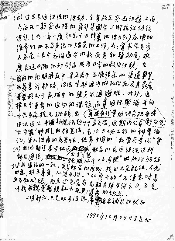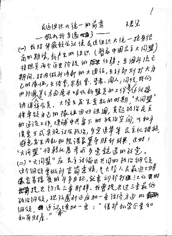 (一)我对华盛顿会议使民运组织大统一抱有很高的期望,新产生的组织(暂名中国民主大同盟)将担负两个历史阶段的任务:在国外流亡期间对内做到内部大团结,在外部则扩大自己的队伍,在侨界,宗教界,学者,闻人,同情我们的外国人等等方面展开吸取新盟员的工作并建议接纳团体会员。大陆在发生变乱的时期,"大同盟"将率领自己的队伍回归祖国,负起政治民主的建设工作,填补中共留下的政治空间,以和平演变方式实施议会政治,多党选举民主化措施,避免发生内乱和阴谋家篡夺胜利成果。这时,"大同盟"将转化为参与多党竞选的政党。