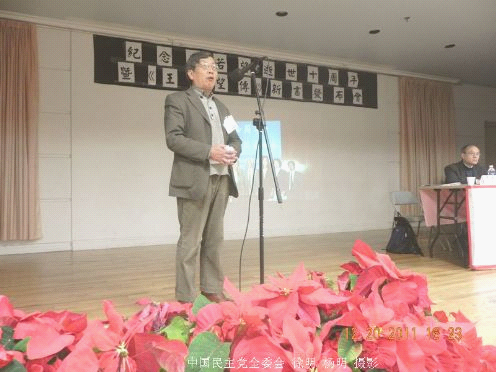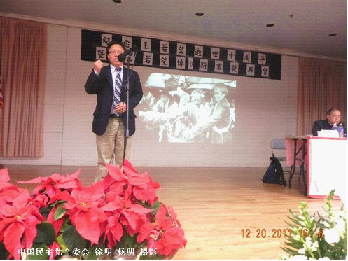 胡平先生演讲 喻智官为其新书作了说明。喻智官说:“从共产党营垒中走出来的高级干部,彻底反叛如此的舍王若望其谁?王若望的最可贵之处,还不在于对共产党的反叛,而在 于反叛的彻底性。这种彻底性在他同侪的反叛者中是独一无二的。” 耄耋之年的陈家骅、何天开和张涵珠女士的回忆也是非常感人。陈家骅先生是王若望先生的老朋友,也是一位资深编辑、作家,他深情回忆与王若望在一起工作时的 点点滴滴,陈家骅在回忆文章中写道:王先生被认作是自由化的老祖宗,受苦一生。他不平凡的行事作风,不屈不挠的耿直脾性,勇敢的追求精神,是反专横权谋的 一位英雄,一条好汉,受到千千万万人的瞩目。众人热爱他,崇敬他很自然,也是理所应当。无疑他将永远活在人们的心间,让仇视者惭愧汗颜。也是进取之士的强 大依托,是最好的榜样。陈家骅老人称王若望是“纯金般的人物”。会上发言的还有熊若磐女士、辛灏年、于大海、王军涛、陈破空、刘晓东女士、袁红冰、沈良 庆、俞梅荪、麦燕庭女士、遇罗锦女士、茉莉女士、陈维健、秦晋、张伦、万之、方能达、谢维勤、施卫江、李国涛、黄河清、王策、曹长青、嵇伟女士、杨巍;未 能与会者由人代读。发言者有的是王若望夫妇多年的共同朋友,有的是和他们夫妇在纽约一起合租房子生活多年的老朋友,有的是在上海时就认识和了解王若望家庭 的人,有的是在国内就一起反抗专制的战友,有的则是出国以后结识的同道,大家一致颂扬王若望先生高尚的道德情操和人格魅力,肯定王若望坚定的彻底的反叛精 神,是中国反抗运动的伟大先行者。“顺服配合”的犬儒主义、投降主义在高扬的王若望彻底反叛精神下必将无处遁身。十年前王若望先生的追悼会是最多华人参加 的葬礼,十年后,王若望精神依然被人们颂扬。