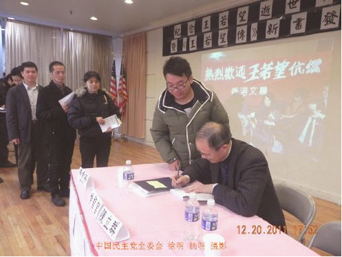 作家喻智官先生为来宾签名赠书 王若望彻底反叛精神由其十年前的“岂愿苟活吾土,宁肯客死他乡”铭记在史册,又由这次逝世十周年纪念会得以弘传光大。王若望遗孀羊子女士说:“在我们纪念 王若望逝世十周年时,适逢阿拉伯民主之春风起云涌,中国民众深受鼓舞,各类维权运动以前所未有的声势发展,我灰暗的心又亮堂起来,前行的道路上又看见了光 明。我坚信,在中国走向民主化的征途上,会有更多人承继你的遗志,传递你点燃的薪火继续猛进。” 曹长青先生撰文表示:“旅居爱尔兰的华人作家喻智官写出一本中文专著《独一无二的反叛者——王若望传》。该书“序言”以盖棺论定的口气说,在流亡海外的老 一代中共反叛者中,王若望是最彻底的,是独一无二的。我很认同这种说法。”曹长青说:“无论在世界任何地方,尤其是在中国,最需要的是率真、坦诚,敢於喊 出真正心声的勇敢者,而不是矫情十足、故作高深、计谋远超过智慧的伪知识份子们。 独立中文笔会出刊的网络杂志《自由写作》月刊推出“王若望逝世10周年(2001-2011)纪念专辑”, 以纪念毕生追求自由、反抗专制的中国著名作家、公民人权领袖王若望。这个纪念专辑,由多位现居中国国内的自由作家特别撰稿。该纪念专辑发表了《故人往事十 年祭——王若望先生与“上海星期文学讲座”》(郁郁)、《忆若望先生》(蔣亶文)、《硬骨头王若望》(阿钟)、《从左翼作家到持不同政见者——纪念王若望 先生》(石建哲)、《王若望:光荣的背叛》(刘也)等文,作者中有二十多年前与居住上海的王若望有过文学交谊的先锋诗人、小说家,他们回忆了王若望在推动 思想自由、表达自由的大时代中向青年一代文学人身传言教的音容笑貌、动人场景。有作者感佩王若望是一位“战士型的作家”,并向读者揭示“犬儒主义像病毒一 样传染着的中国”,“他(王若望)的伟大人格,却在这个时代尤其凸显出他的可贵”。这些情真意切的纪念文章彰显了王若望作为“中国民主启蒙思潮的一种永不 泯灭的精神征象”在中国大陆持久而深远的影响。现流亡美国的上海异议人士李国涛也为该专辑撰文,并在纪念会上发言,缅怀当年在国内时受王若望鼓励一起致力 于公民人权进步斗争的难忘岁月。 羊子女士代表家属最后致答谢。喻智官为《王若望传》签名赠书,索书者踊跃。与会者拍照留念。 台湾会馆taiwanus.net网站全场直播了纪念会实况。 [博讯来稿]