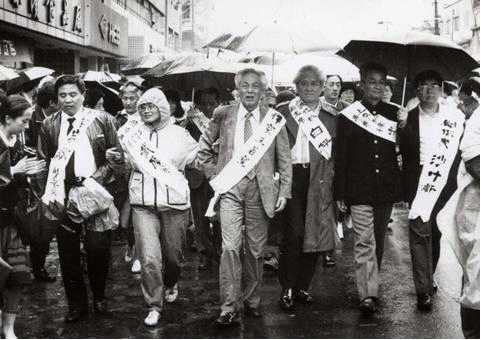 1989年4月,王若望(中)在上海參加遊行,爭取新聞自由,支援學生運動